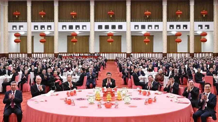 人民大会堂宴会厅灯光璀璨、暖意融融,各界人士欢聚一堂、共迎新春,欢声笑语间洋溢着节日的喜庆气氛。