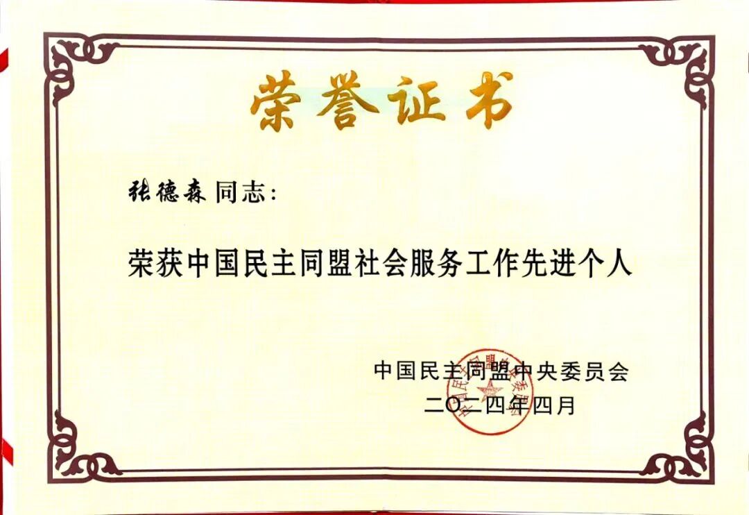 2024年4月,民盟社会服务工作会议在浙江兰溪召开。全国人大常委会委员、民盟中央副主席谢经荣出席开幕式并讲话,会议对在社会服务工作方面取得突出成绩的先进组织和先进个人进行了表彰,青岛大森酒业集团董事长、北京大森画院院长张德森同志荣获“中国民主同盟社会服务工作先进个人”荣誉称号。